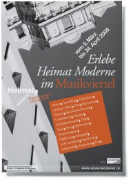 For the many events that comprised 'Heimat Moderne' we designed four posters. We designed two posters for the initial opening event of 'Heimat Moderne im Musikviertel' 5 March – 24 April 2005 (the second of the two posters was a revision). The third poster we produced was for 'Achtung Augustusplatz' 22 April – 9 Juli 2005, and the fourth poster was for 'Brühl/Robotron' 26 August – 11 September 2005.